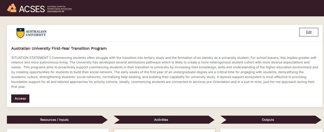 Built on the Student Equity in Higher Education Evaluation Framework (SEHEEF), the ACSES Program Logic Model (PLM) Tool is a web-based App that will help you build a PLM – a ‘road map’ showing the shared relationships among the resources, activities, outputs, and outcomes for your activity or program.